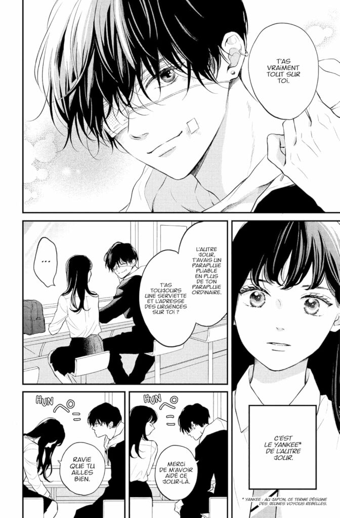 Si le synopsis m’a immédiatement tapé dans l’œil, c’est surtout la mention du jeune homme aux allures de yankee qui m’a convaincu. J’aime varier mes lectures, et ce mélange entre romance lycéenne classique et ambiance furyo (en toile de fond vraiment) avait quelque chose d’assez intriguant. Et honnêtement, cette intrigue tient justement largement ses promesses.