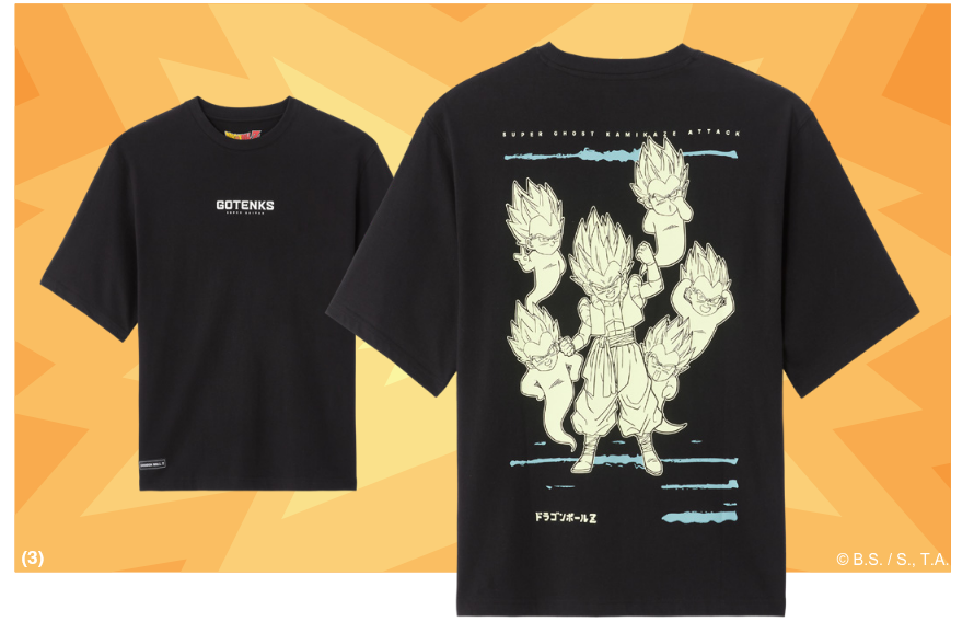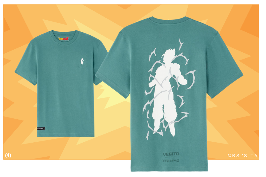 Impossible de passer à côté du t-shirt dédié à Super Végéto, l’une des transformations les plus marquantes de la saga. Présent à la fois à l’avant et à l’arrière, il s’impose comme une pièce forte pour les fans du guerrier ultime né de la fusion.