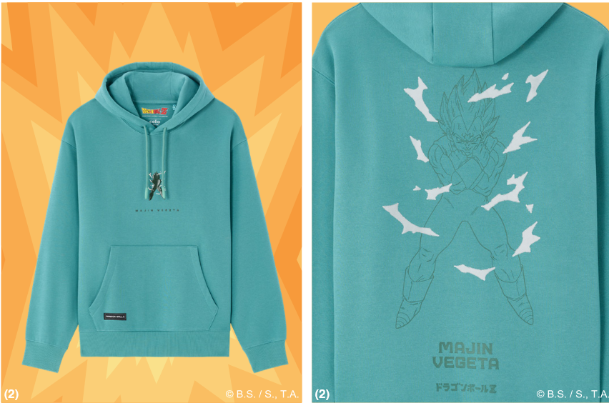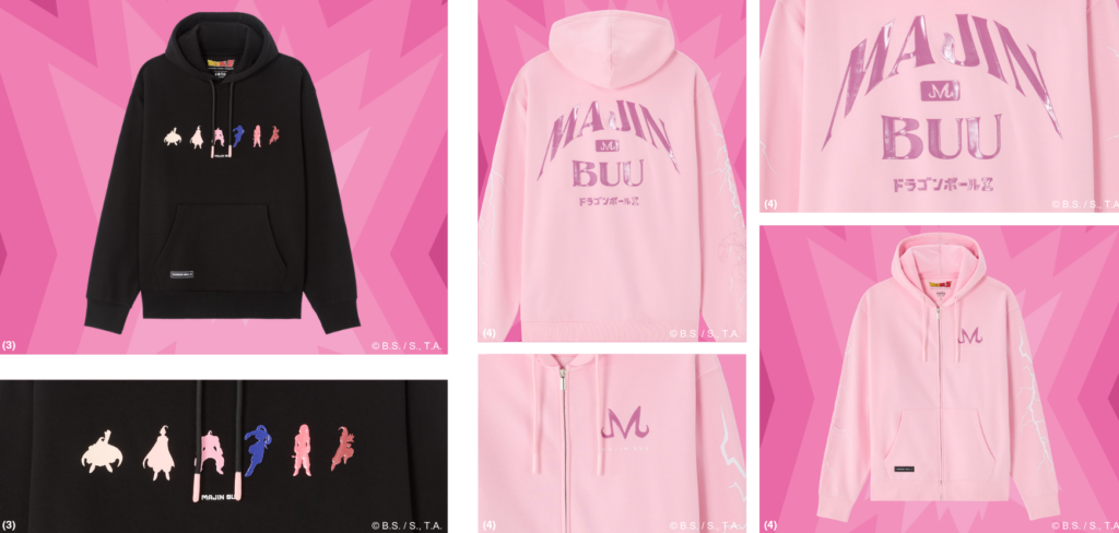 Majin Végéta, transformation adorée des fans, est lui aussi mis à l’honneur à travers un sweatshirt qui affiche fièrement son symbole, jusqu’au logo Majin brodé sur la capuche. Majin Buu n’est pas en reste, avec plusieurs pièces déclinant ses différentes formes ou son esthétique rose bonbon, immédiatement reconnaissable.