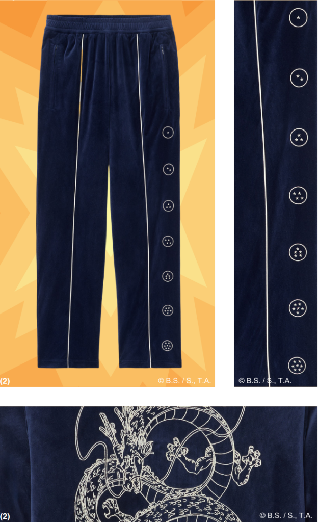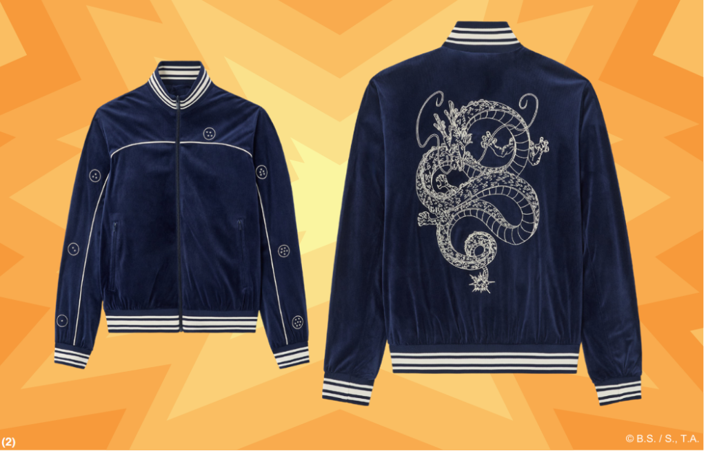 Autre pièce forte : un ensemble en velours bleu, composé d’une veste et d’un pantalon, décorés de Shenron et des 7 Dragon Ball. L’ensemble joue sur un équilibre entre tenue sportive et clin d’œil appuyé à l’univers de la série, avec des détails soignés jusque sur les manches et les jambes.