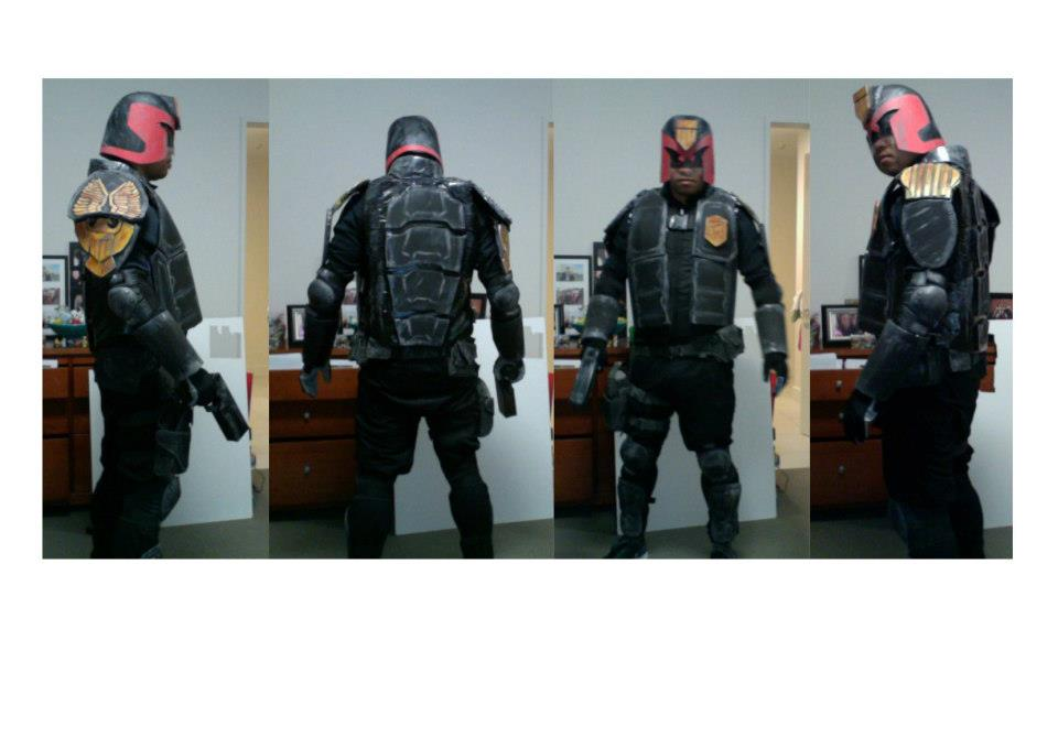 Mon premier cosplay, c’était… Alors je travaillais dans le retail, et nous avions une fête de Noël. Le thème c’était les héros. Alors j’ai réalisé un costume du juge Dredd avec du ruban adhésif et du papier mâché. C’était mon premier en 2012.
