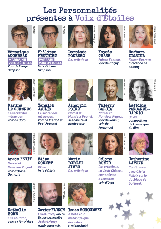 Fidèles au poste, Véronique Augereau et Philippe Peythieu, les voix mythiques de Marge et Homer Simpson, reviennent en marraine et parrain du festival. À leurs côtés, une brochette d’artistes viendra à la rencontre du public : Dorothée Pousséo (Harley Quinn, Margot Robbie) animera un atelier de doublage, Kaycie Chase (Vice-Versa, Stranger Things) présentera un concert avec Pierre Elgrishi sous le nom Billet Doux, et Catherine Lafond, la voix de Phénicia dans Goldorak, sera présente pour une conférence inédite autour du doublage.