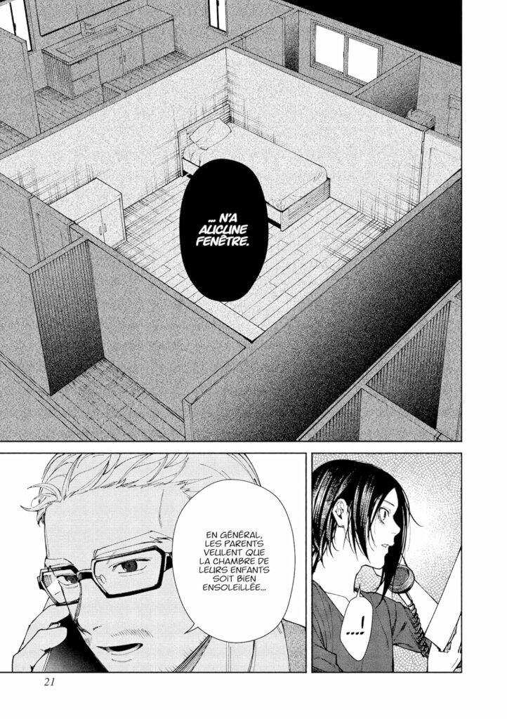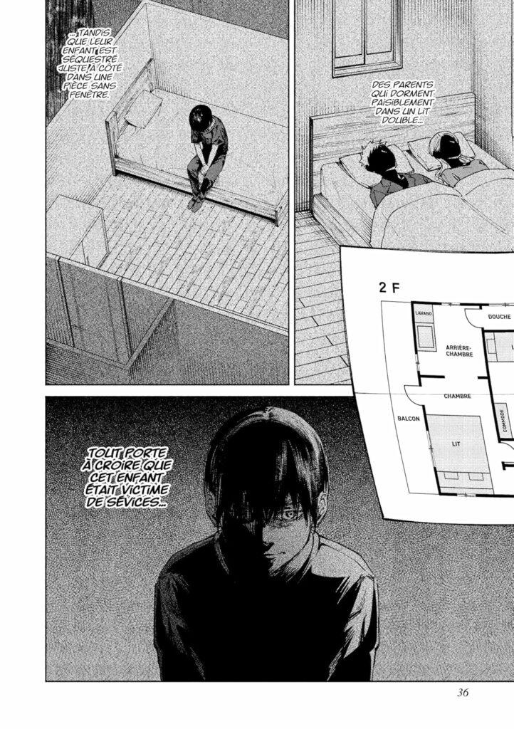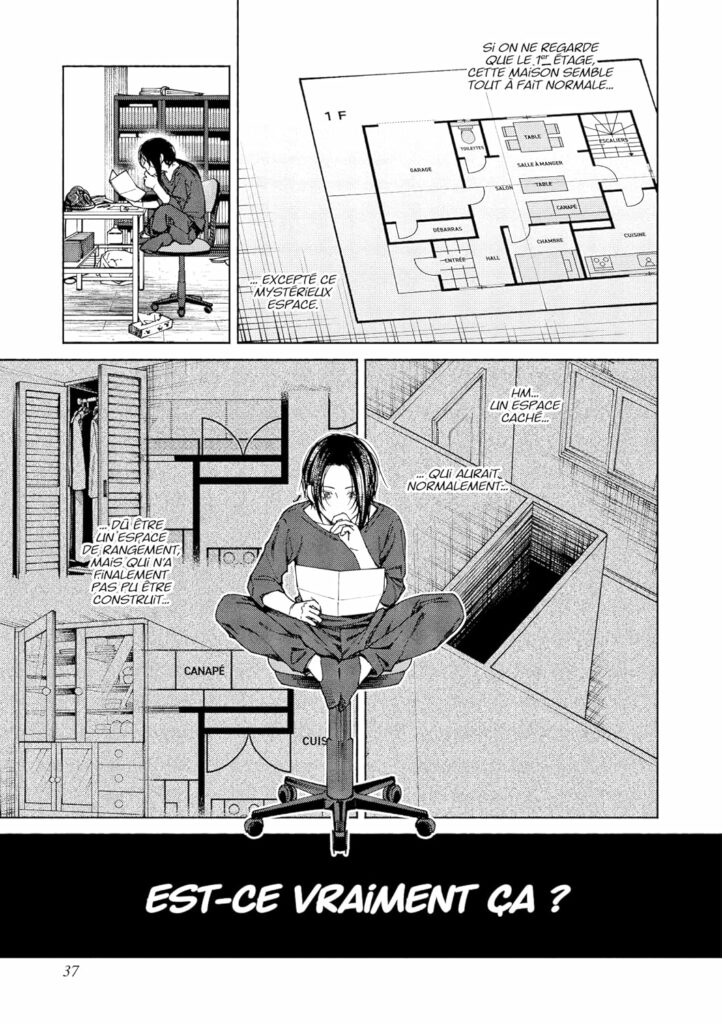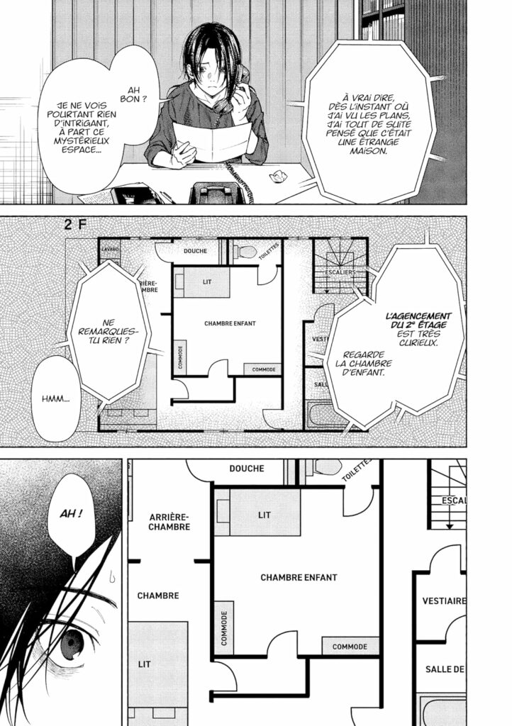 Le manga suit un pigiste spécialisé dans le paranormal, accompagné d’un architecte fasciné par les structures étranges. Ensemble, ils décortiquent les plans d’une maison dont l’agencement laisse supposer des actes atroces, peut‑être même des meurtres. L’idée d’utiliser l’enfant du propriétaire comme instrument discret pour éliminer les invités paraît improbable, presque absurde, mais elle participe à cette atmosphère de décalage où la logique sociale se fissure, où les comportements deviennent opaques, presque inhumains.