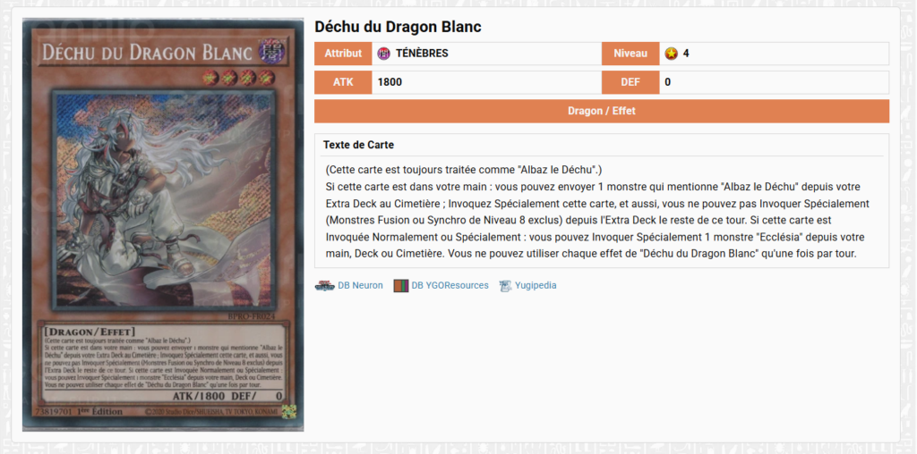 - Du support pour les decks branded qui vont revenir dans la compétition avec le Déchu du Dragon Blanc qui va pouvoir accélérer les combos et étendre les possibilités.